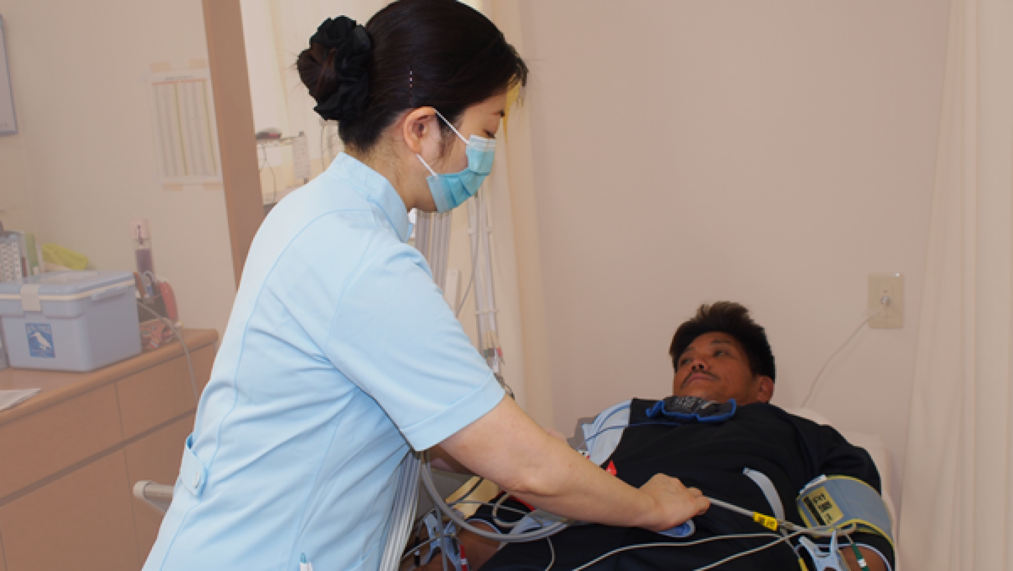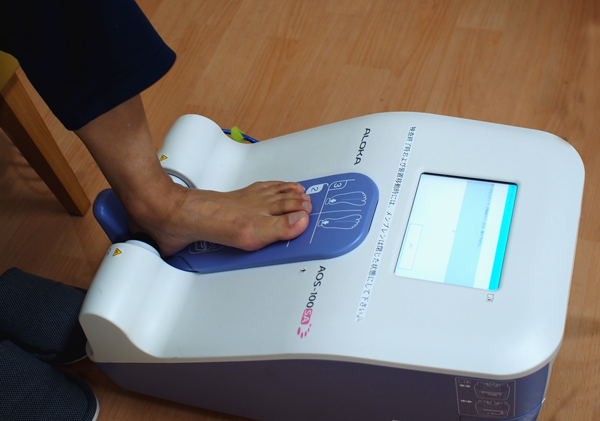 ベッドに仰向けに寝た状態で、電極を装着し、両腕と両足首に血圧計を巻いて測定します。