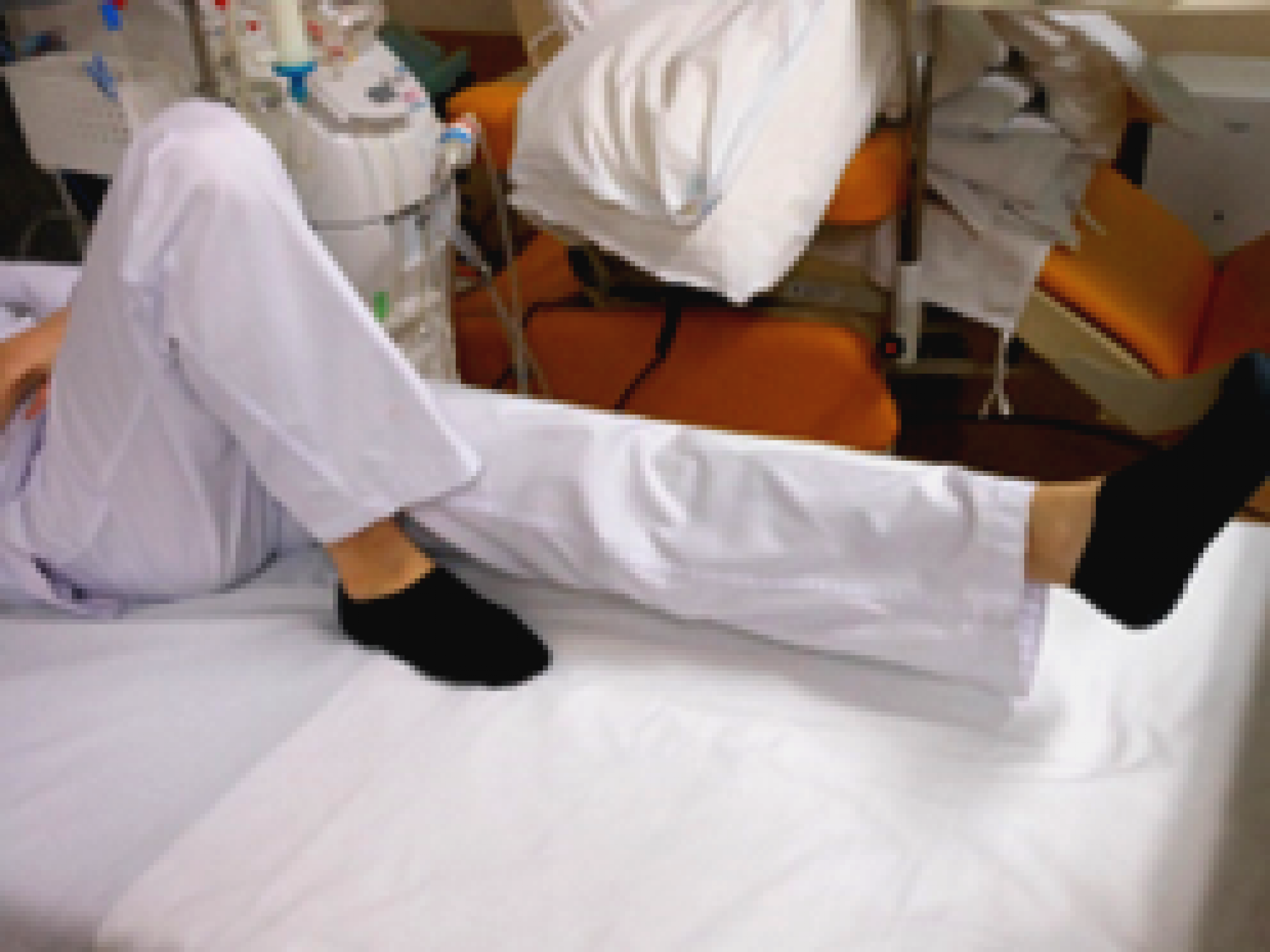 腎臓リハビリテーション学会のガイドラインに基づき、週3回の透析時に運動療法を行っています。透析時に行う事で週間化され、フレイル・サルコペニアを予防し、骨折予防、透析患者様の筋力維持を目的として行っています。