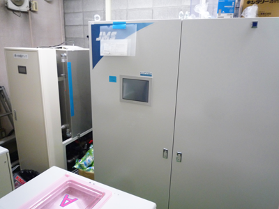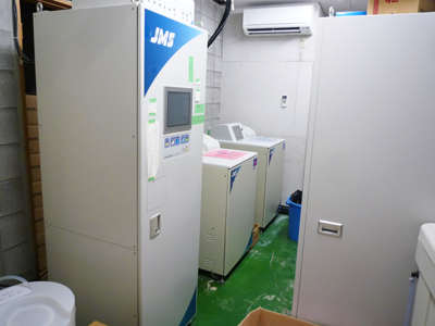 2F機械室ではA/B棟用の透析液,C棟用の透析液をそれぞれ作成し3F透析室に送液しています。機械はすべてJMS社製で統一しています。