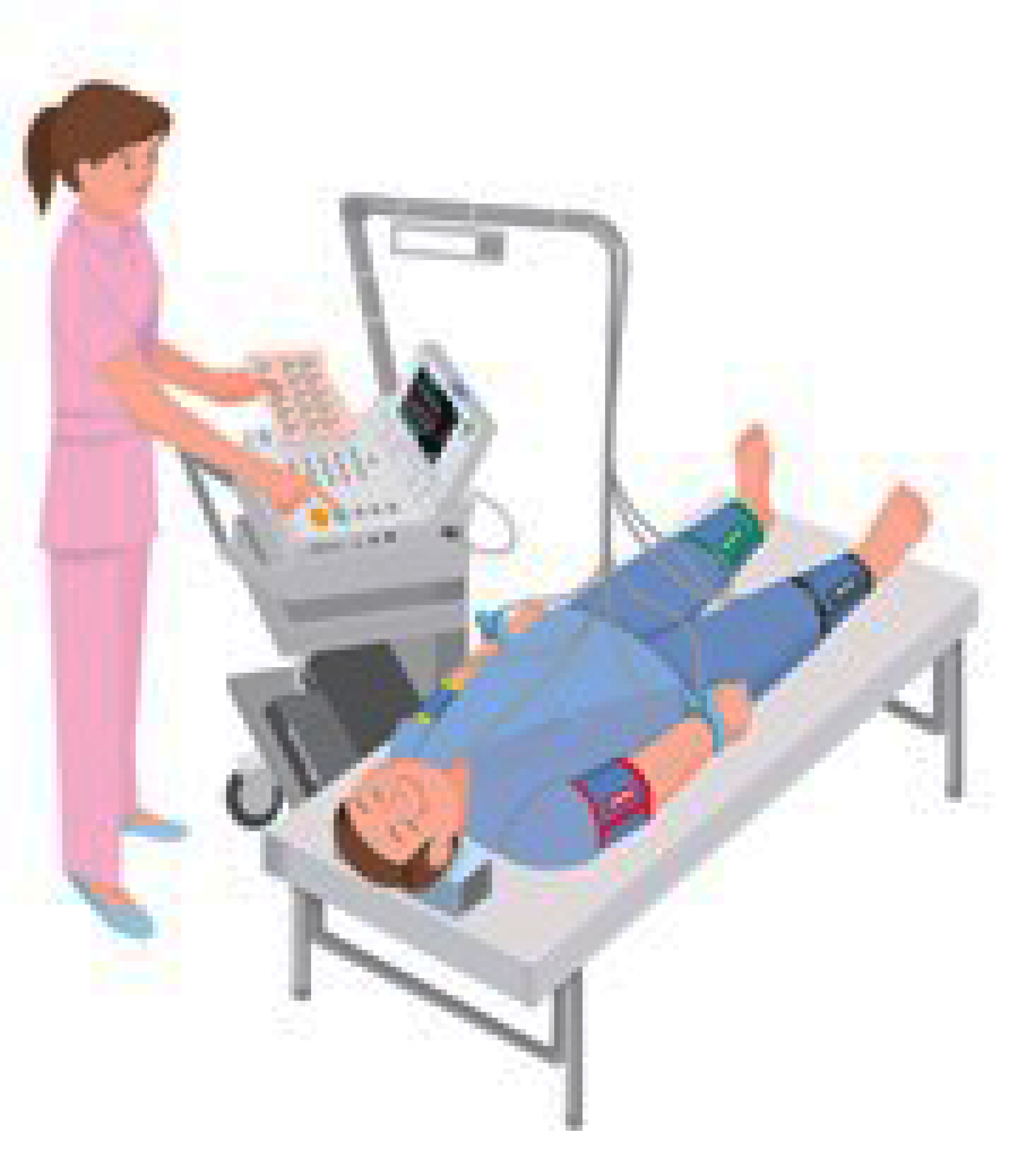 足関節上腕血圧比とは、上腕と足首の血圧比を測定することで、動脈硬化の進み具合を調べる検査です。基準値は1.00~1.4です。1.4以上だと血管璧が固くなっている事や基準値以下だと血管が狭くなっている事が疑われます。当院では、下肢動脈疾患の早期発見の為に定期的に測定を行っています。