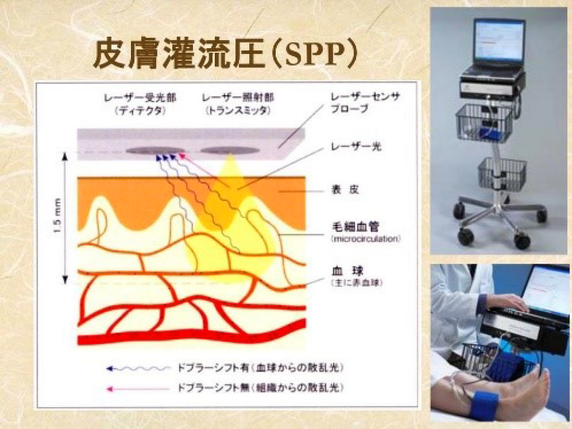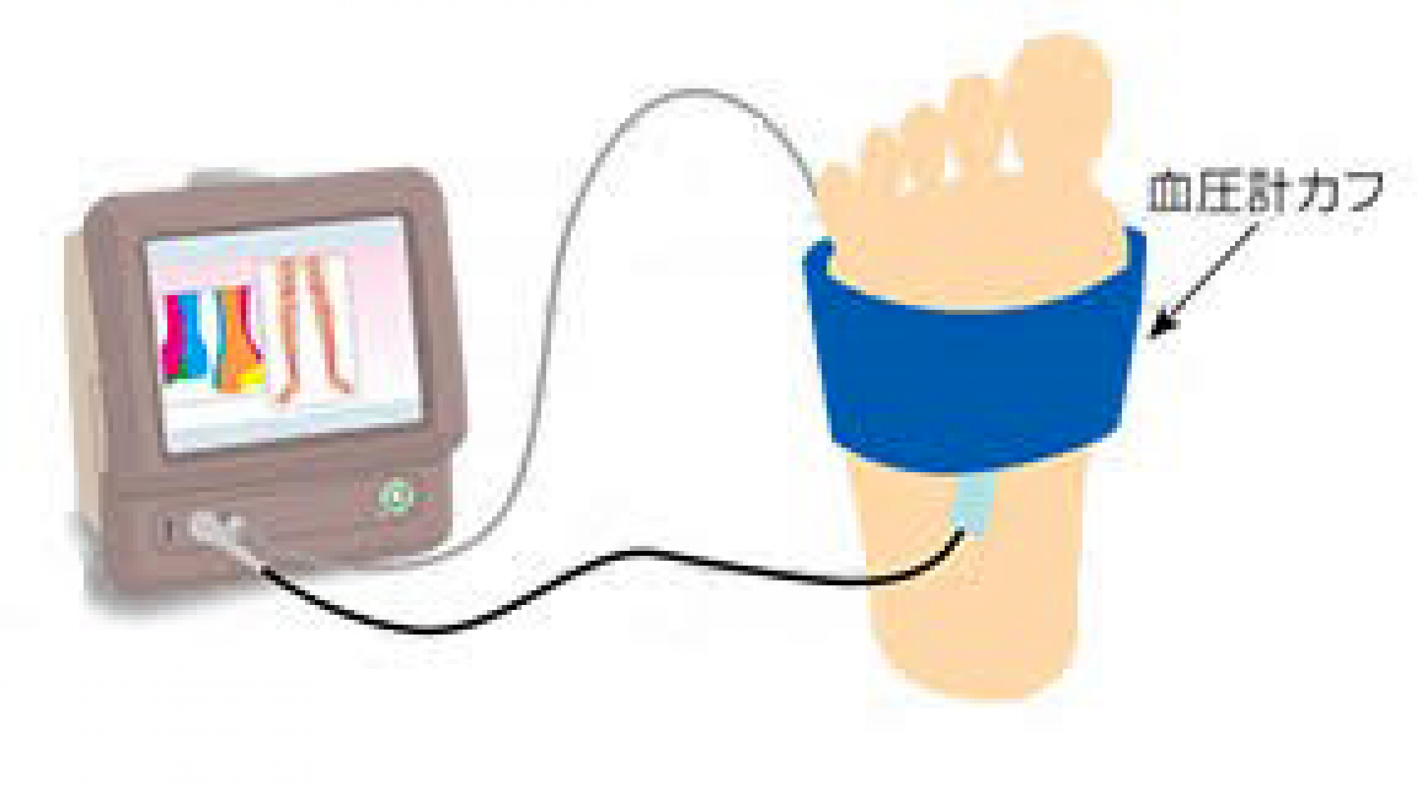 皮膚灌流圧測定とは、下肢虚血(足の血液の流れが悪い・遮断している状態)の重症度の評価・治療効果の判定に用いる検査です。皮膚表面の細かい血管の流れを確認する検査であり,下肢閉塞性動脈硬化症の重症度を評価できます。基準値は、50mmHg以上です。40~50mmHgで軽度の疾患、30~40mmHgで中程度の疾患、30mmHgで重篤な疾患として、下肢虚血が疑われます。