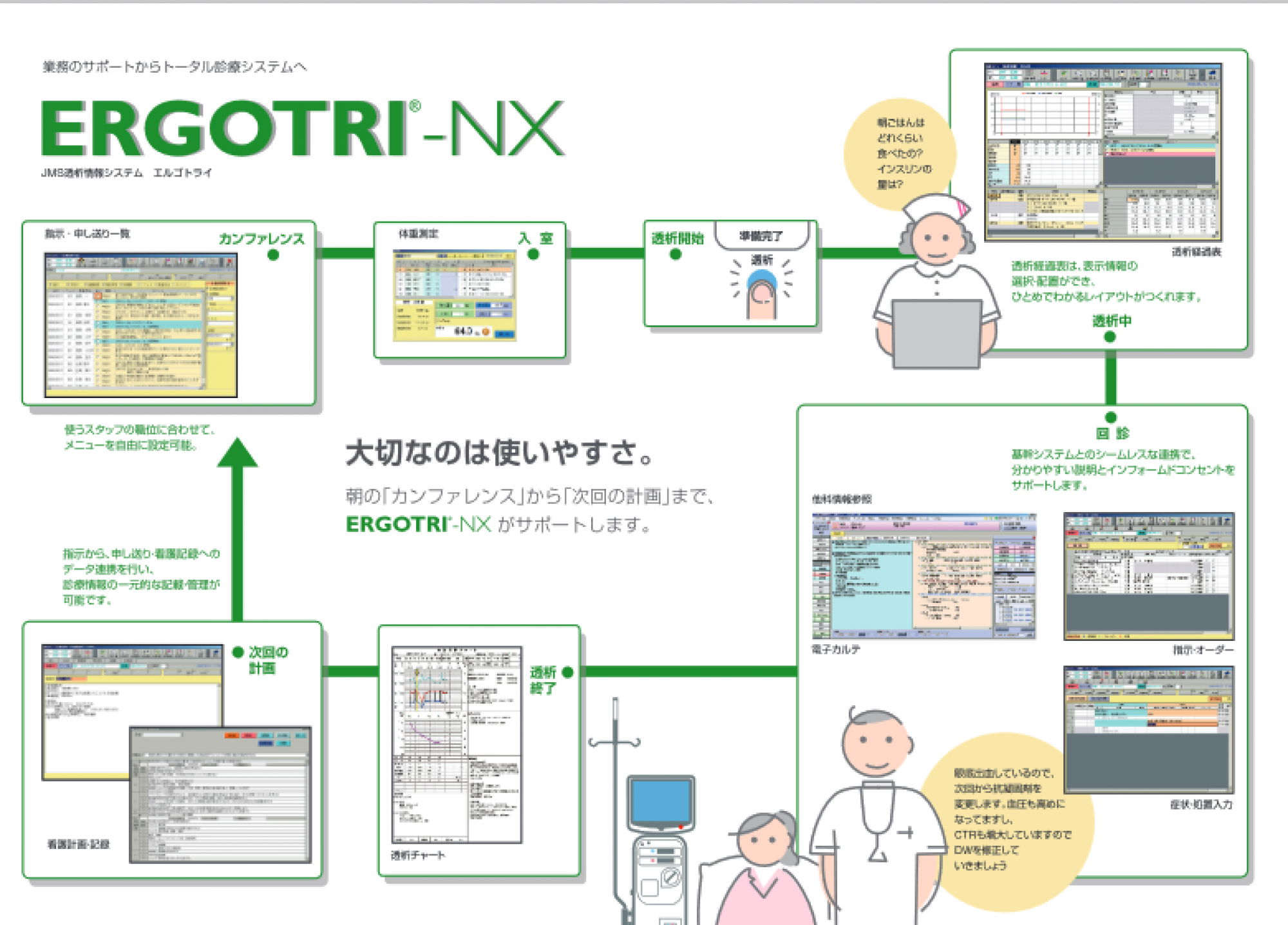 電子カルテと血液透析装置を連携し、バイタル・装置データ・メンテナンス情報などのデータの自動取集が可能です。また。透析記録用紙やメンテナンスレポートの作成をサポートします。電子カルテとオーダーリンクシステムと連携する事で情報共有を可能にし多様化した透析業務の効率化を図っており、安全な透析と提供しています。